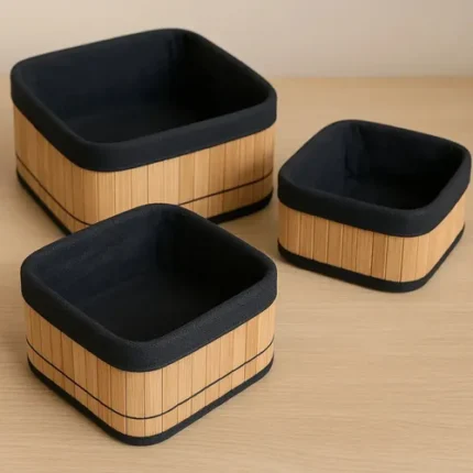🔥 3 Cestos Caixa Organizador De Palha E Bambu Com Forro De Linho Cor Preto Decora Ambiente E Organiza Sala Quarto Armário Escritório Cozinha Banheiro Cesto Multiuso Boho Moderno Material Premium