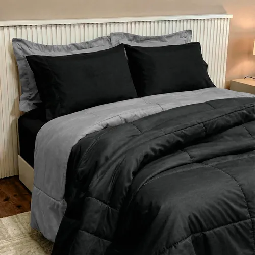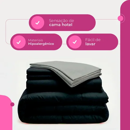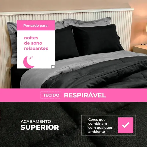 🔥 Edredom Casal Kit 6 Peças Com Jogo De Lençol Queen Padrão Cor Preto E Cinza